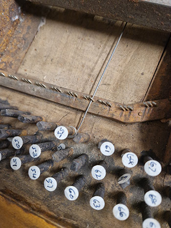 - Beim compensation frame wird die Saitenspannung von einem Rahmen aus [im Falle von Flügel #7886] drei Messing- (im Bereich der Messing-Basssaiten) und sieben Stahl-Röhren (im Bereich der Stahl-Saiten) aufgenommen, so dass das hölzerne Korpus von der Saitenzugkraft komplett entlastet wird und die Rasten auf ein Minimum reduziert sind: Die hölzerne Rast dient lediglich der "allgemeinen Stabilität" der Konstruktion. Die beim durch Instrument #7886 repräsentierten Modell insgesamt zehn Röhren werden durch fünf an den Kreuzungspunkten mit den Röhren ausgekehlte hölzerne Querspreizen, die mit der Rast verspannt sind, in Position gehalten.